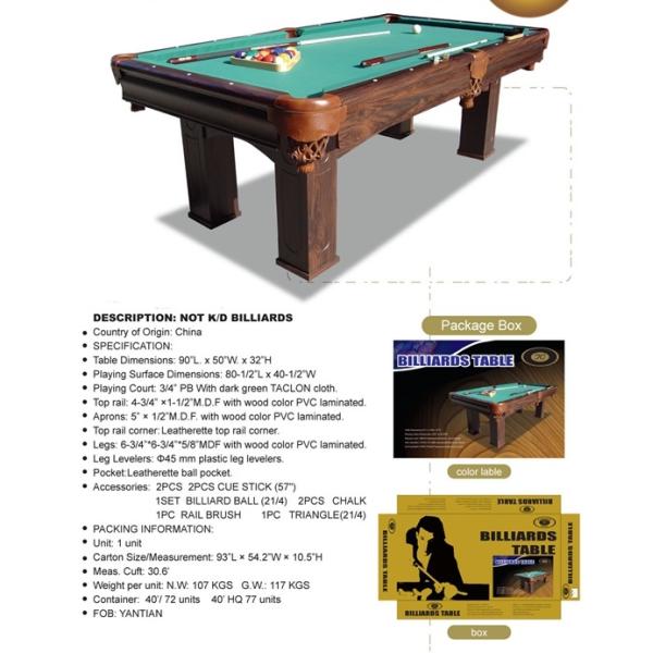 | Accessories: | 2PCS | 2PCS CUE STICK (57") | 1SET | BILLIARD BALL (21/4) | 2PCS | CHALK | ||||||