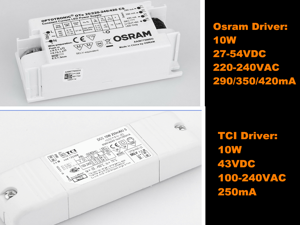 | Input: V / I | 27-54V, 290/350/420mA | 43V, 290mA |