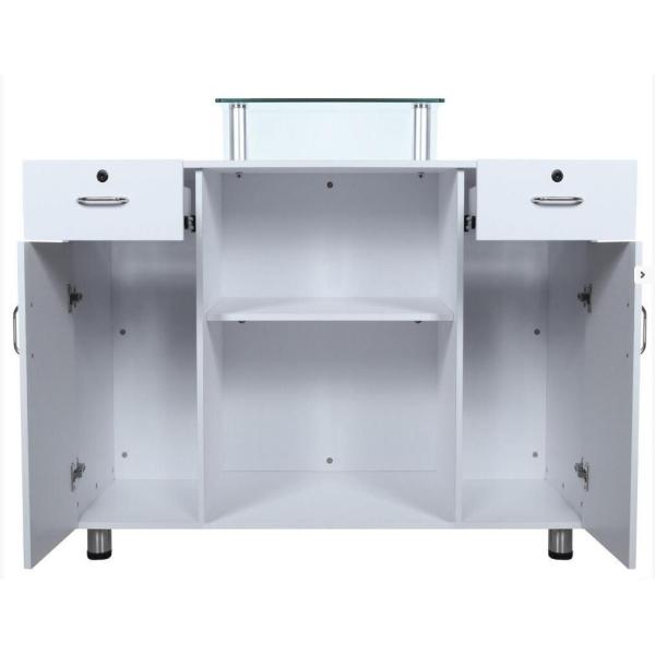 It is a modern design cashier counter, can work for salon counter, hotel reception table, store cashier, or any other counter, it is made by wood with acrylic decoration. in the middle it is a glass decoration, while for the counter, it has two derawer with two big cabinet for storing. also two open cabinet with door for easily storing too.