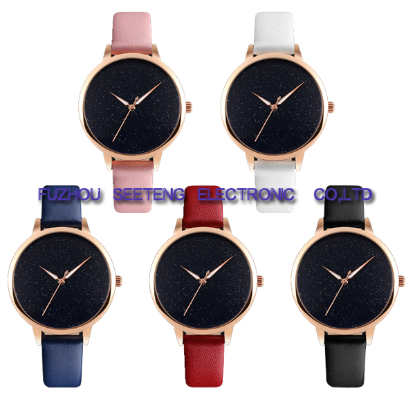 | Name | Simple and clean starry sky dial golden alloy case ladies watch with colorful pu leather strap |