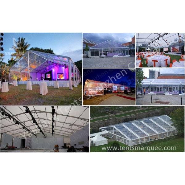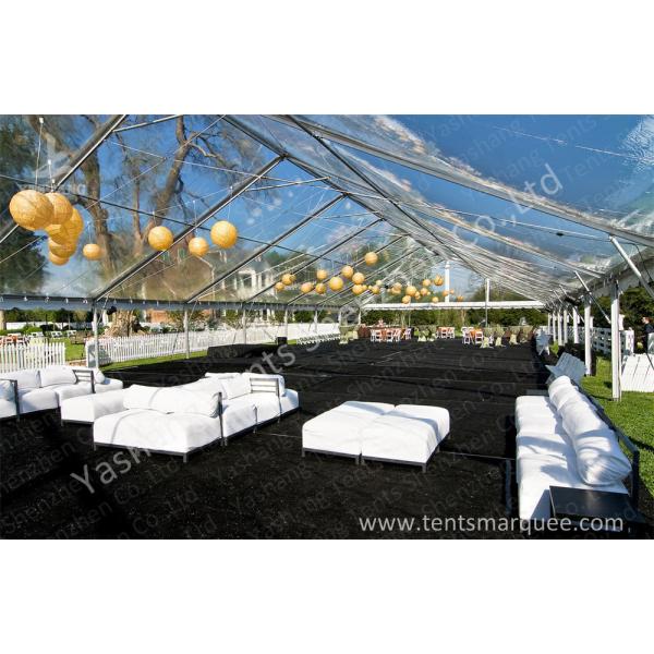 This large clear span transparent PVC fabric tent structure was set up on the lawn. There are three kinds of fixation methods: expansion screws, steel peg nails and weight load plate, while on this tent project, the fixed method is used by the steel peg nails which is suitable for the grassland. Transparent top roof tent is not only beautiful, but also fast to erect up and dismantle, which means that it is available to move to other places to hold other events. That is the reason why our customers choose the transparent top roof tent.