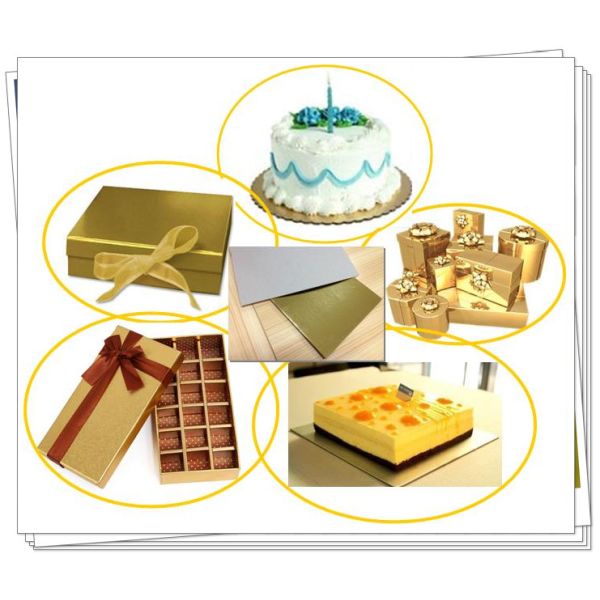 | Usages | 1.Gold cake board , Sliver cake board , white cake board and etc.. 2.Packaging:make box for cosmetics,telephone ,cigarette,toys,stationary 3.Decoration 4.Puzzles,Paper File |