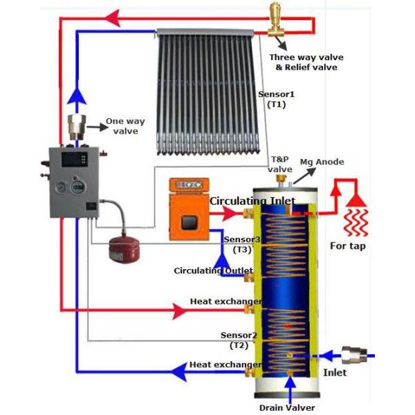 An internal coil is pre installed in storage tank as heat exchanger, a heat-transfer liquid circulates through solar collector to tank coil for heat exchange between the closed loop and main tank water.