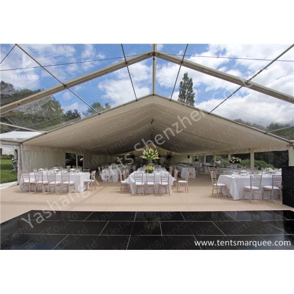 The outdoor temporary wedding party tent structure has a clear roof fabric cover and walls. The clear roof canopy tent not only can be a great venue for outdoor shows and events, but also can be decorated into an ideal place for outdoor wedding parties and banquets. The transparent fabric can be 600g/m2 ~ 1200g/m2, the clear PVC fabric proposed for roof cover is normally 930gsm with the thickness of 0.75mm. Some customers will require the transparent tent fabric to be UV resistant, so our sunscreen aluminum tent can satisfy their needs.