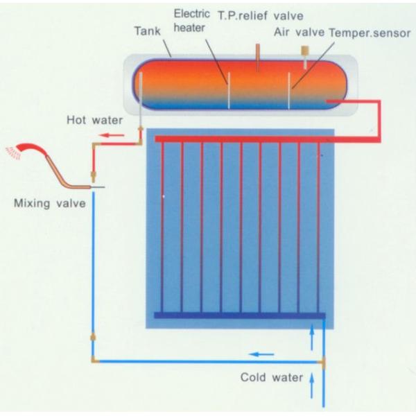 Pressurized flat plate solar heater is a tank of roof-mounted system,using the thermosiphon principle to transfer heat from collector to water inside tank.