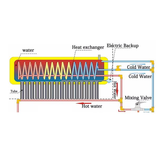 A pile of copper coil is pre-installed inside the non-pressure solar water heater tank, the water inside storage tank will reach a highest temperature due to local solar irradiation and duration in the single day, when pressure tap water goes through the copper coil and it absorbs enough heat from hot water stored inside the tank, hence at the outlet of copper coil we get instant and pressure hot water.