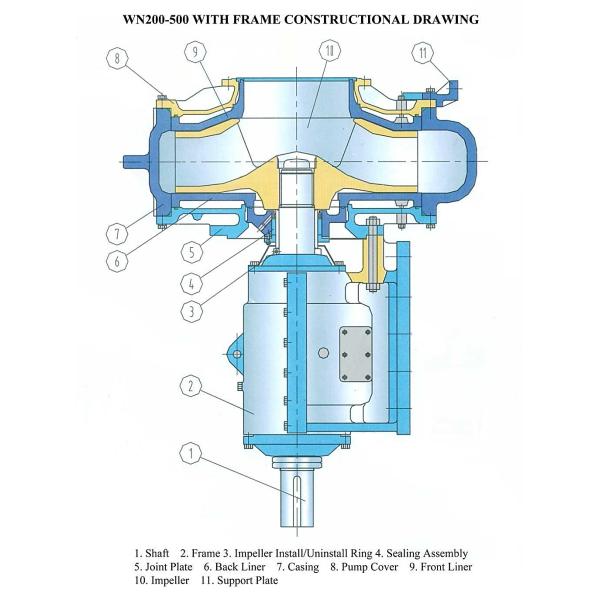 600WN to 1000WN dredge pumps are of double casings, single stage cantilevered centrifugal pumps. These pumps are equipped with frame and lubrication is force thin oil. The design of double casing the pump working till the volute liner almost worn down and guarantee no leakage when volute liner is worn down.