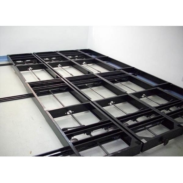 . Consists of fixed shelves installed on mobile chassis at bottom