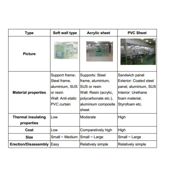 Though clear division is not available, "Clean room" term is used in case of building or room. A space enclosed by PVC curtain or resin panel is considered as "Clean booth" in case of willingness to increase the cleanliness factor in a clean room or air-conditioned room. Size is 1.5m to 5m and clean air is introduced in the booth with a provision of FFU (Fan Filter Unit) in the ceiling.