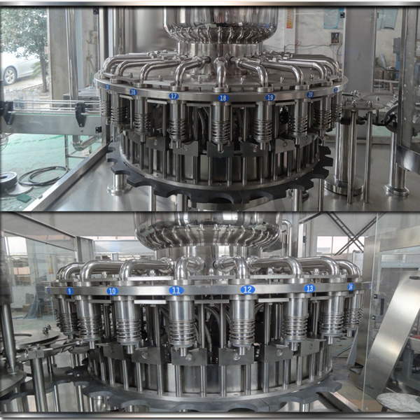 Rinsing: The rinser clutches bottles from the starwheel, holding bottles by their necks. gradually turn them upside down while rotating, It will send the bottles to the rinsing area where spraying water come from up above, washing bottles throughly.