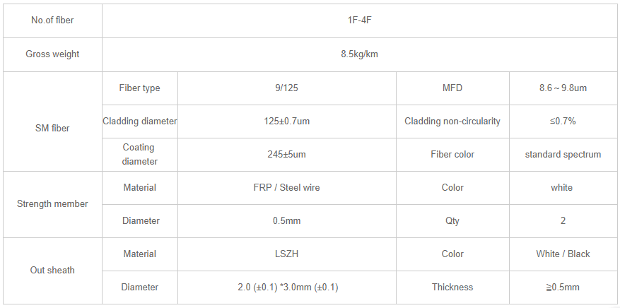 The optical fiber unit is positioned in the centre. Two parallel Fiber Reinforced Plastics (FRP) are placed at the two sides.then the cable is completed with white LSZH sheath