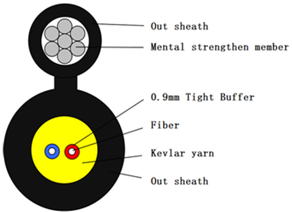 The optical fiber unit is positioned in the centre. Two parallel Fiber Reinforced Plastics (FRP) are placed at the two sides. A steel wire as the additional strength member is also applied. Then the cable is completed with a black or color LSZH sheath.
