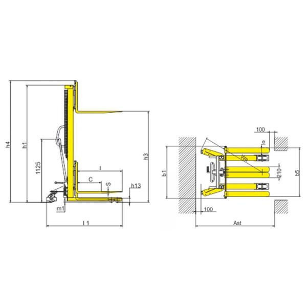 • ​​​Manual pallet stacker with adjustable forks and special handle.