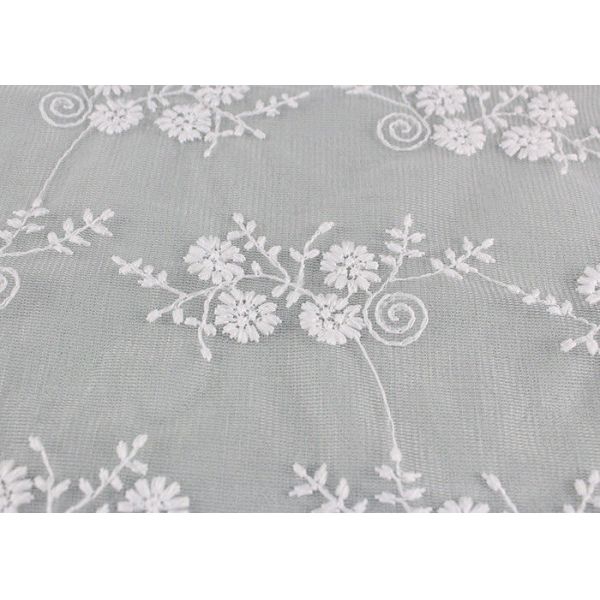 Embroidery lace fabric: beautiful design, unique technology, relief pattern has a slight effect, the touch is more gentle after the fine processing. Embroidered lace fabric or lace dress posing wedding design is not uncommon. This wedding material transparent and delicate, many girls like to use it to express their romantic temperament.