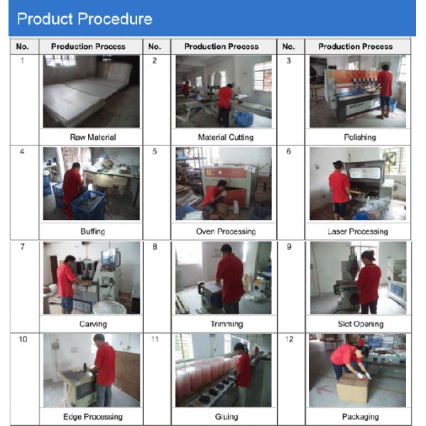 | Main Process | Cutting, trimming, polishing, gluing, hot bending, printing/engraving, spray painting |