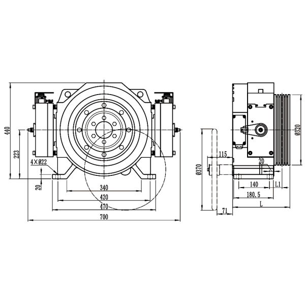 | Spec | Elv Load(kg) | Elv Speed(m/s) | Sheave Diam(mm) | Sheave Groove | Current(A) | Power(KW) | Speed(r/min) | Freq(Hz) | Torque(N.m) | Poles | L(mm) | L1(mm) | Undercut Angle(0) |