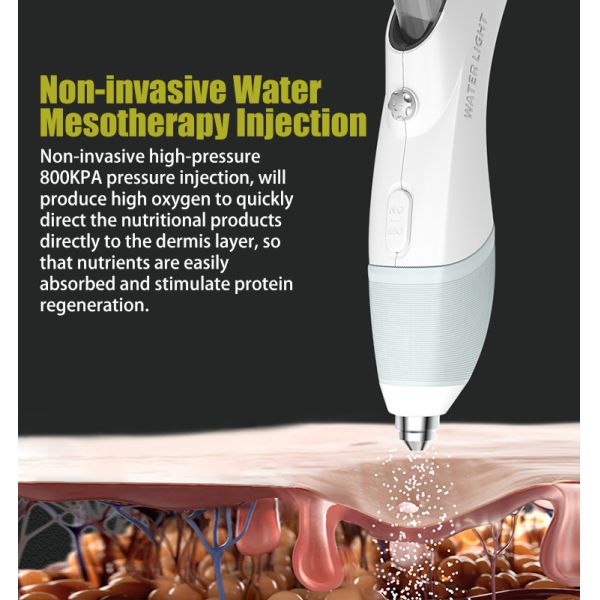![]() | NON-INVASIVE WATER MESOTHERYAPY INJECTION Non-invasive high-pressure 800kpa pressure injection,will produce high oxygen to quickly direct the nutritional products directly to the dermis layer,so that nutrients are easily absorbed and stimulate protein regeneration |