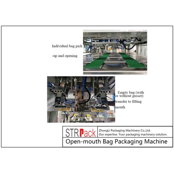 * The automatic packaging machine can pack granular and powder materials into premade open mouth bags automatically, It can realize automatic bag feeding, bag opening, bag loading, products filling, bag sealing and others.