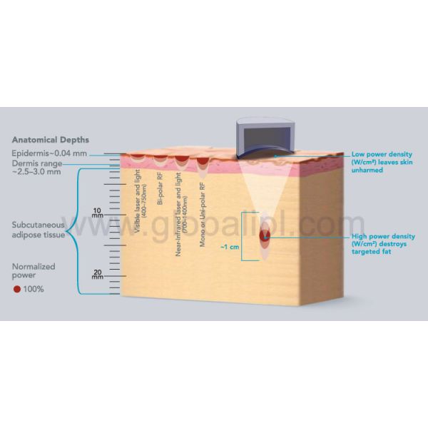 HIFU shape Theory: HIFU shape adopts high intensity focused untrasound(HIFU),which deliver focus energy at a precise depth and disrupts localized fat deposits.By focusing on treatment of HIFU technology,use heat destory the subcutaneous fat and reduce fat permanently at the same time,which can reach deep subcutaneous 0.8cm&1.3cmcm for treatment.Also directly stimulate the collagen contraction and thickening,quickly fill the gap after melting fat,make the skin smooth and water embellish as before |