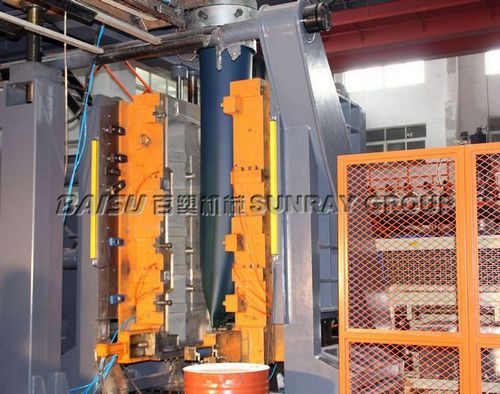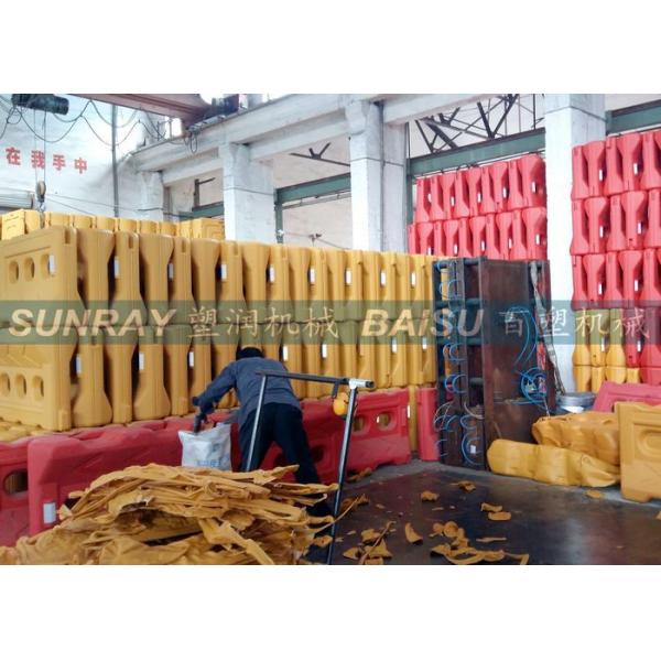 Plastic road barrier blow molding machine SRB120Z is widely used in plastic traffic barrier, road block, road barrier and barricade making field, water tank and water storage containers making field, also used for large barrels, drums, plastic pallet and large board-like hollow products. In normal production, the cycle time is about 180 seconds. Its production capacity is 12 pcs/hour, daily output is 288 PcsThe key technical points lie in precise die and core size, blow pin head diameter and design, head blow software control, air exhaust software control, also the mould’s air exhaust position design and cold water runner design for smooth product surface, product strength quality and production capacity. Besides EBM machine, we also provide on-line auto deflashing plastic blowing moulds, and auxiliary machines such as auto-loader, color mixer, scraps crusher, water chiller, air compressor, air accumulating tank, leakage tester, in-mold labeling machine and so on. We help customers to get one stop service of manufacturing, exporting and technical supports.