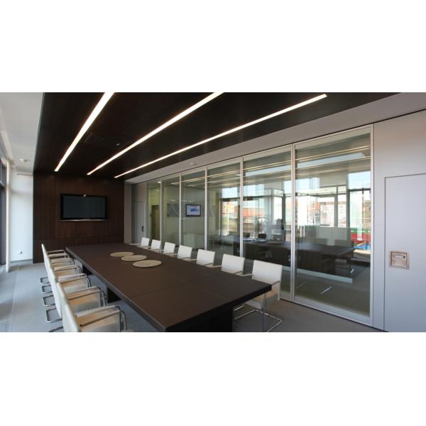 The partition system provides a perfect solution for storefronts, restaurants and office environments where the transparent space utilisation is the key requirement. It comprises of toughened glass panels secured in top and bottom profile elements which glide smoothly along an overhead track system.