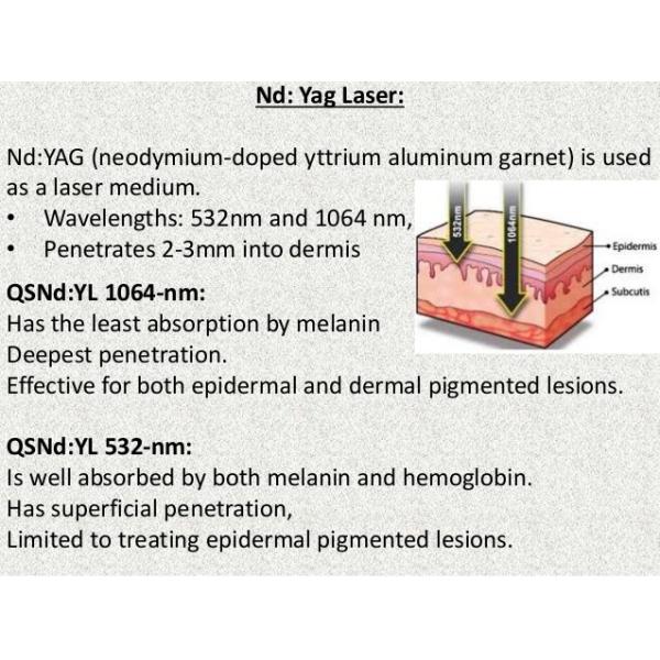 Q-switched Nd: YAG laser radiates the light with a specific wavelength in high peak energy pulses, hence the light penetrates into the tissue only for a nanosecond. The light is absorbed by the pigmentation and results in an instantaneous blast, that is Light blasting principle. The pigmentation particles are shattered into fragments, some can be bounced out of the skin and others can be split into tiny particles that can be engulfed by phagocytes and then eliminated by the lymphatic system.