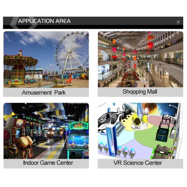 The VR Motor has 4 games,include dinosaur track,Scifi track,Circuit track and Highway track.VR motor is suitable for different age,like children, teenagers and adults.Player can experience the bumpy road of the dinosaur track, the fast speed of the circuit track, the thrilling of highway track and the feeling of space driving on the Scifi track.