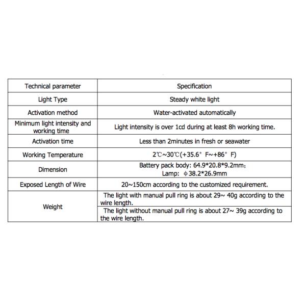 This survivor locator light can be installed on floating devices such as aviation life jackets, life rafts and lifeboats which are carried by airplane. The light will be automatically activated to output the steady white light over 1cd light intensity during at least 8h working time as soon as contacting with water. No matter what kind of flotation device the light is installed on, the users should ensure as following: