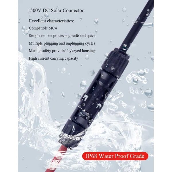 Solar connector is most used in solar photovoltaic power generation system of a special connector, the connector (compatible with connector) is a solar pv panels in series with a parallel array module when the special connector, reliable connection rapidly, waterproof and dustproof, easy to use etc, shell has strong anti-aging, uv resistant ability, the cable connection adopts the hoops and clamping method connection, male and female head fixed with stable self-locking mechanism, open and close freely.It is an indispensable and important part of solar power system.Product science structure, selected materials, ensure that the mechanical and electrical properties are good.