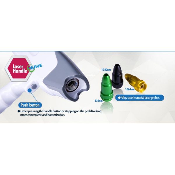 C: Nd: Yag Laser for all kinds and colors tattoo removal, birthmark removal, eyebrow line/ eye line/ lip line, pigments removal. There are 3 probes with different wavelength (1064nm,532nm,1320nm)for treating different items.