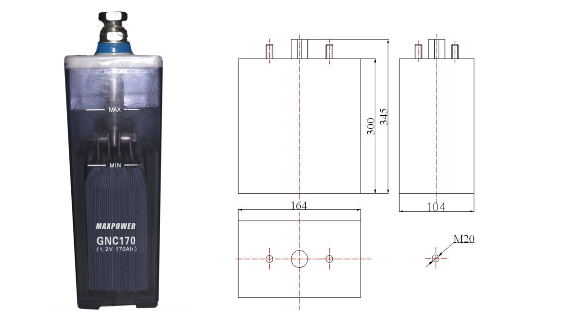 | Nicad | Nominal | Rated Capacity (Ah) | Dimension(mm) | Thread of pole | Weight (filled) (Kg) | Electrolyte Volume (L) | Container Material | ||