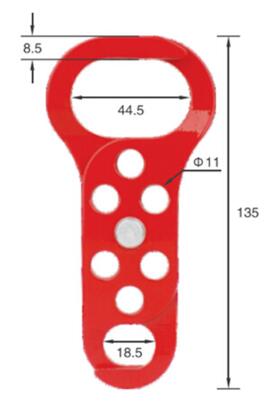 Scissor action lockout hasp manufactured from plated steel. Finished in a durable, highly visible red coating, with 45mm*32mm & 19mm diameter jaws. Overall length 137mm. Accepts padlocks with a shackle diameter up to 11mm.