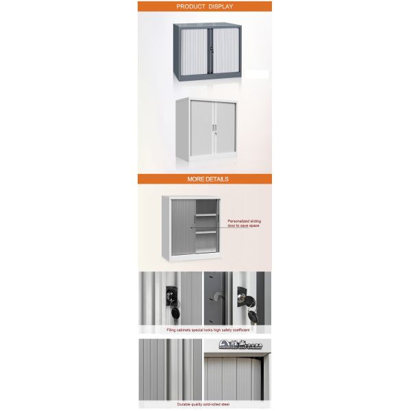 2 Rolling shutter doors half height storage lockers filing cabinet are intended for holding documentation, proprietary and business information, tangible properties, etc. They are particularly well-suited for small offices and premises with narrow passages, where there is no capability to employ regular swing door cabinets. Cabinets of this type are in demand at banks, law firms, accounting departments of businesses, archives, etc.