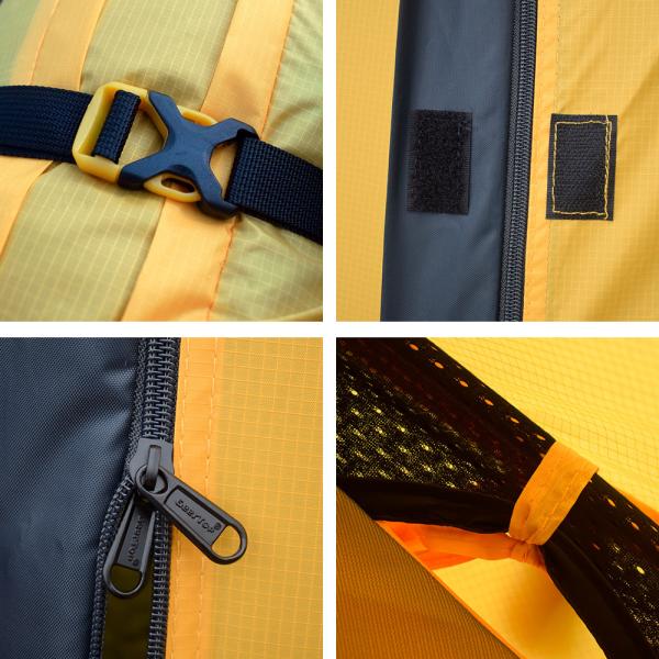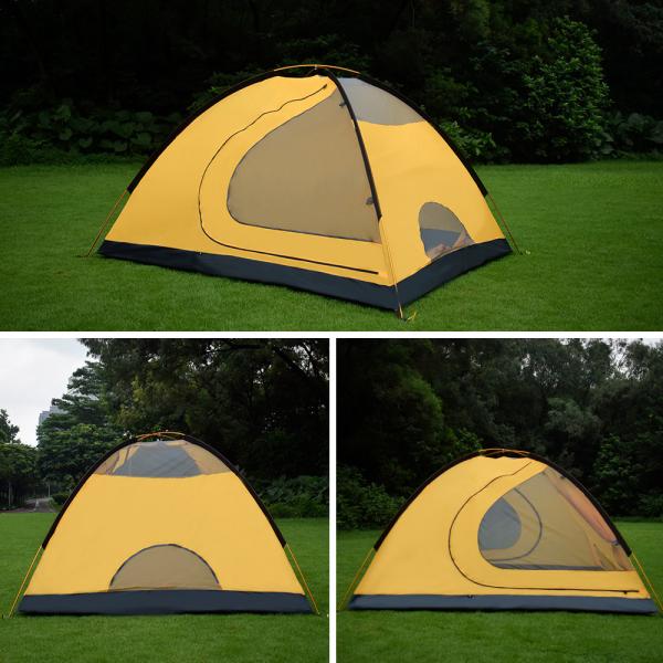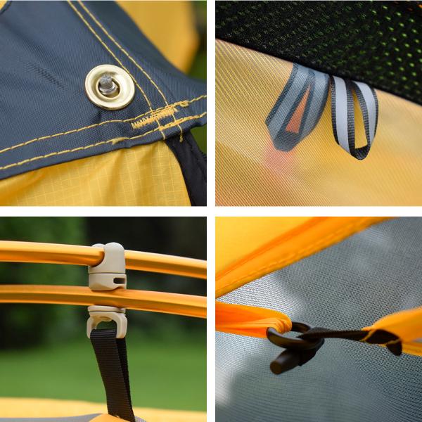 The High Quality Materials : The tent is made from high quality material which is fully rain proof and extremely light weight. Double stitched seams are perfectly sealed for complete waterproofing and improve durability. Four corners of this tent are waterproof and durable. The strong aluminum poles add plenty of stability with little weight gain. Durable double-zipper let us can pull the zipper inside or outside, so it is convenient to get in and out.