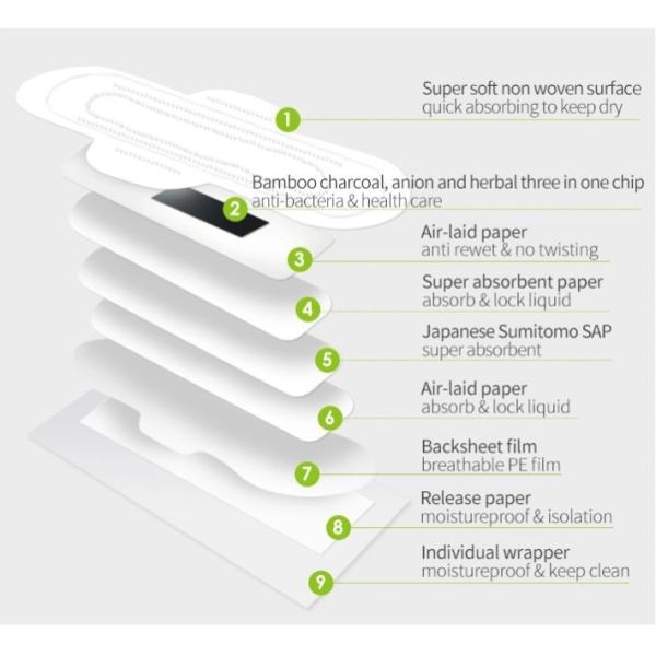 7. Absorption layer:Tissue paper,fluff pulp imported from USA and SAP ; Anti-leak core designed to lock in fluid, keeping the surface always dry; The super-absorbent core solidifies moisture and holds it in the inner part of the pad. |