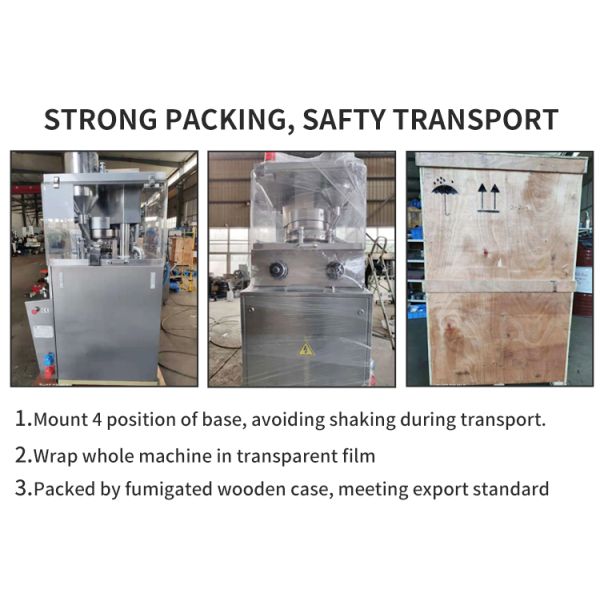 | Packaging Details: | Standard export wood case. the tablet press machine is first wrapped with a transparent film, and then bound in a wooden box to ensure the safety of the machine during transportation. |