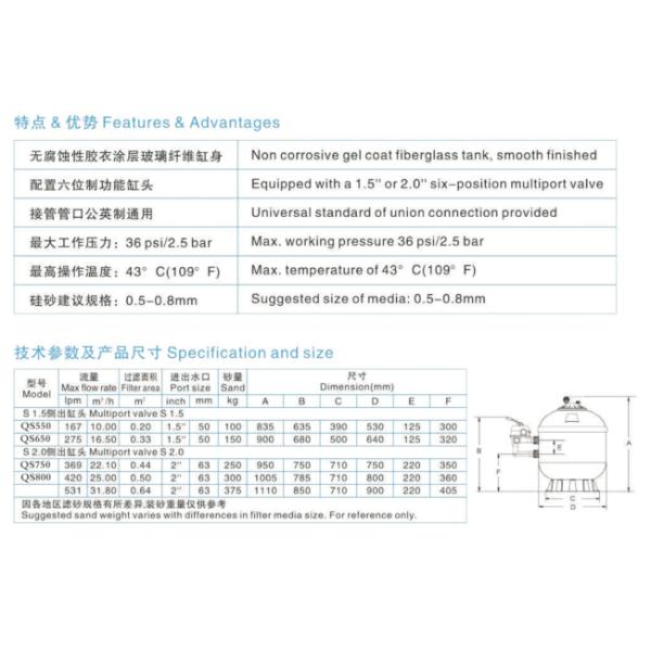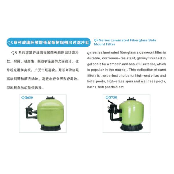 QS550 Manufacturer Supply Swimming Pool Laminated Fiberglass Side Mount Sand Filter is durable, corrosion - resistant, glossy finished in gel coats for a smooth and beautiful exterior, which is popular in the market. This collection of sand filters is the perfect choice for high - end villas and hotel pools, high - class spas and wellness pools, baths, fish ponds etc.