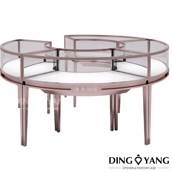 The current size of this Cambered Display Cases For Jewelry is 1450X550X960MM, The diameter of the whole circular is about 2300~2500MM, it will include 4 pcs of curved display cases for jewelry.For all the metal parts, they are finishedwith Fingerprint Prevention Processing .Use the use highly transparent tempered glass with high-end led strip light,they look luxury. Ships Fully Assembled Lockable. We believe that custom made the jewelry display cases with your logo, request color can make your jewerly more popular in the markets.