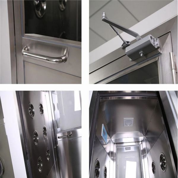 Cleanroom air shower are generally constructed from cleanroom-compatible steel or plastic materials and feature electronically-powered blowers, filters and high-pressure jet nozzles, they all being incorporated into the walls. Air, at velocities of 3,000 to 7,000 feet-per-minute (FPM), continuously streams from the jet nozzles for 30–45 seconds. Personnel inside the enclosure will lift their arms and turn their bodies for uniform exposure to the air streams, a procedure usually specified in protocol. Air currents from the jets create shearing and flapping forces, which lift and remove contaminants from both flat surfaces and the creases of garments. This process effectively removing 99.97% loose particulate matter form cleanroom air shower which particles greater than 0.3 µm diameter.