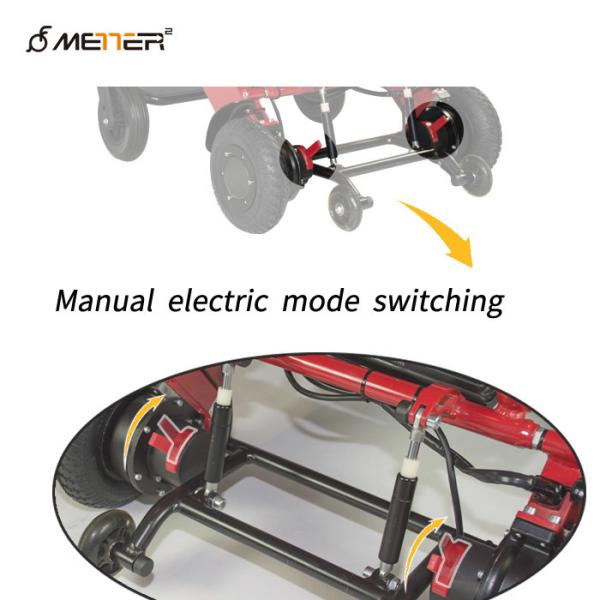 Power wheelchair with flip up armrest. It is very convenient for users to get up and down the wheelchair, and the armrest can be lifted when approaching the table.
