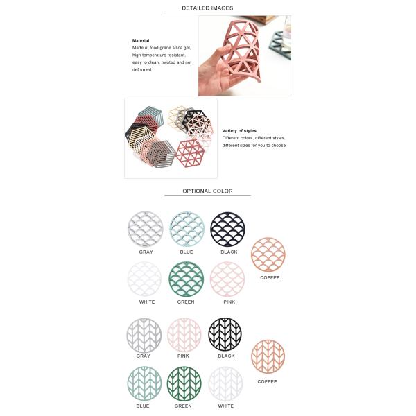 TRIVET MATS MATERIAL:Our heat trivet mats are BPA free and food grade,non-slip,Cyclic use,Our trivet mat hot pads with premium silicone material guarantees that they won't absorb odor, stain, rust, crack or chip.Trivets hot pads size is 6.33 * 5.5 inch,is more thicker than others.