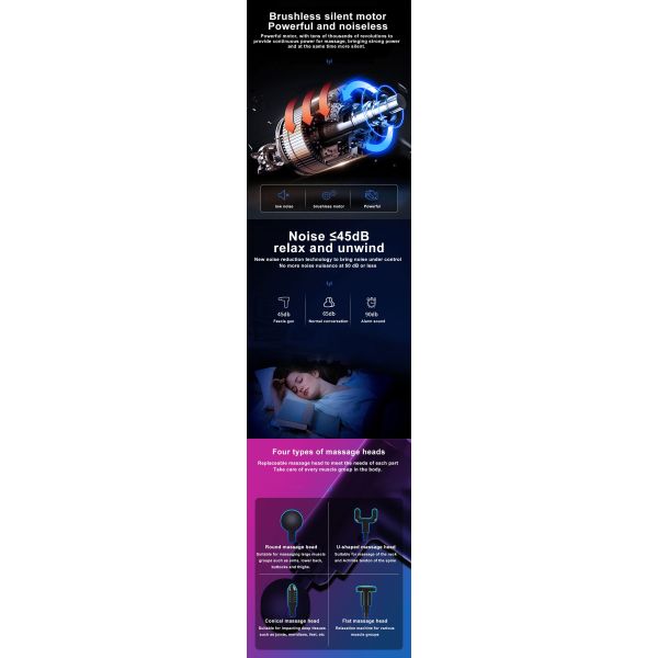 It is quiet. Whisper quiet when compared to other massage guns. There are six custom intensity settings allowing you to focus-on deep tissue work, increased circulation, or mobility. Every muscle is different, different shape, size, function.