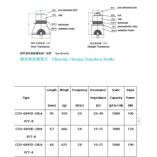 100w 28k Ultrasonic Cleaning Transducer Height 66mm Static Capacity 6600pF