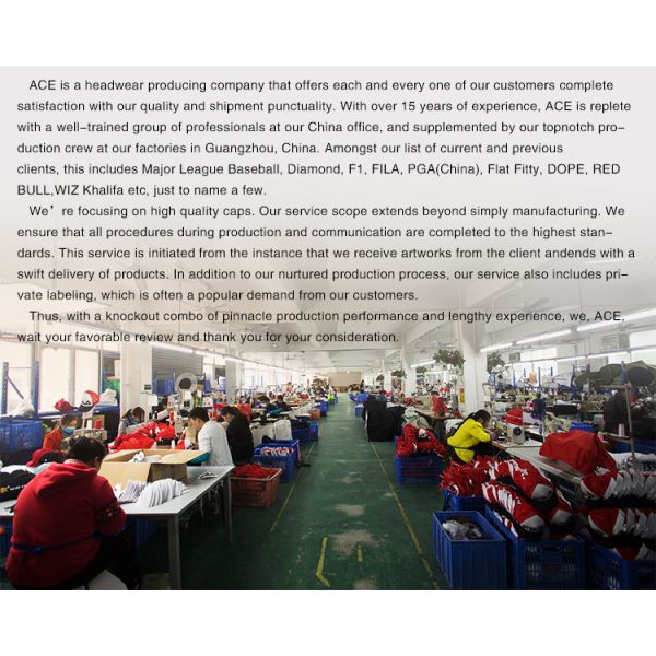ACE is a headwear producing company that offers each and every one of our customers complete satisfaction with our quality and shipment punctuality. With over 15 years of experience, ACE is replete with a well-trained group of professionals at our China office, and supplemented by our top-notch production crew at our factories in Guangzhou, China. Amongst our list of current and previous clients, this includes Major League Baseball, Diamond, F1, , PGA(China), The Simpson's, Descente, Anta, Flat Fitty, DOPE, RED BULL,WIZ Khalifa etc, just to name a few