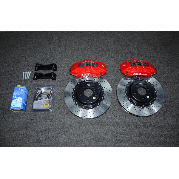 Go fast and stop faster. TEI Racing Big Brake Kits provide you with serious braking power when you need it most. TEI Racing brake kits are offered for both the front and rear brakes with rotor sizes ranging from 285mm-405mm drilled or slotted or drilled and slotted, 2-6 piston Forged Monoblock aluminum caliper options, and custom colors. Stainless steel brake lines, brake pads, and all hardware are included for a direct bolt-on installation where no modifications are required.