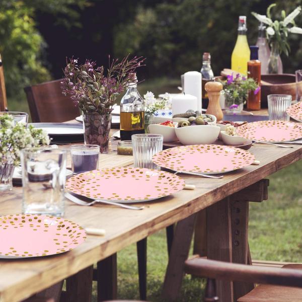 Pink Base Paper Plates With Gold Foil Dots designs. Use these elegant plates for just about any indoor or outdoor banquet.
