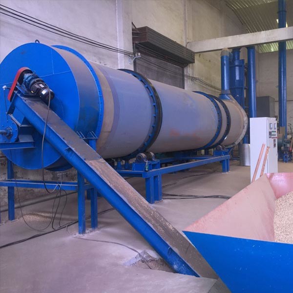 Rotary wood chips dryer is consists of a heating device, feeding device, transport device, discharge device, dust extraction device and other connecting parts. For the installation process, the rotary drum dryer should slopes slightly so that the discharge end is lower than the material feed end in order to convey the material through the rotary drum dryer under gravity. Material to be dried enters the rotary drum dryer, and as the rotary drum dryer rotates, the material is lifted up by a series of internal fins lining the inner wall of the rotary drum dryer. When the material gets high enough to roll back off the fins, it falls back down to the bottom of the rotary drum dryer, passing through the hot gas stream as it falls.