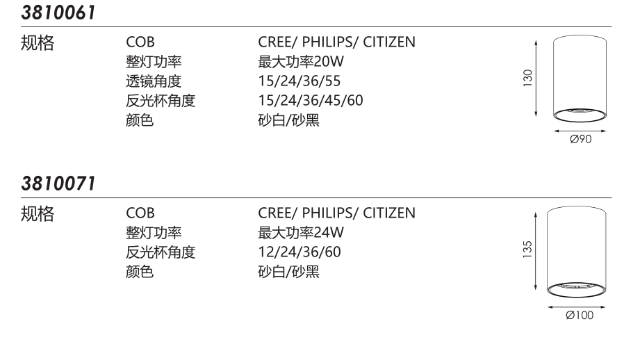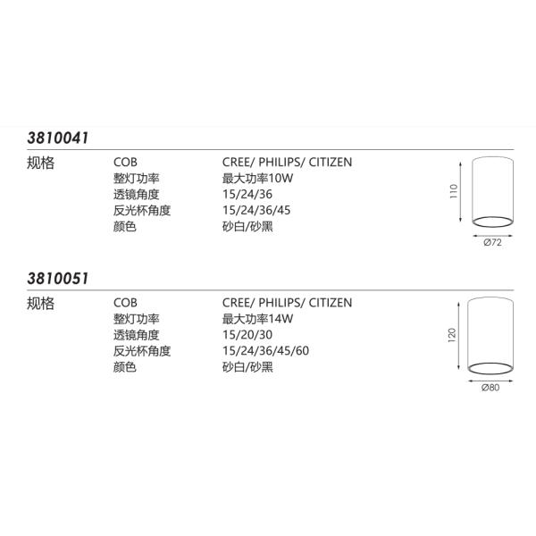 381004110W15°/24°/36°15°/24°/36°/45°φ72*110mmDie-casting AL/ White/ Sliver/ Black