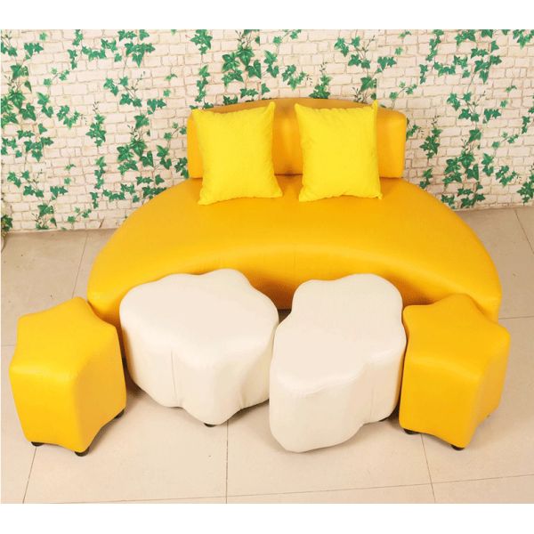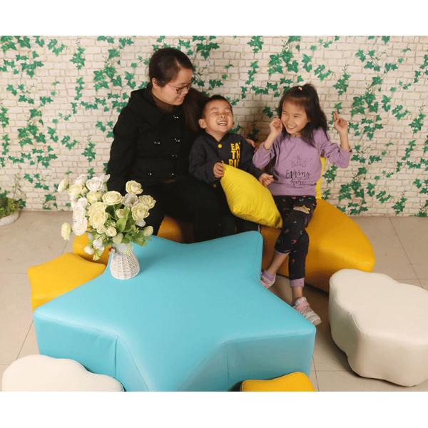 High quality children's room suit, Products include: a yellow moon sofa, a blue star stool, two white cloud stools, two yellow star stools, two random color pillows. Products can be customized.