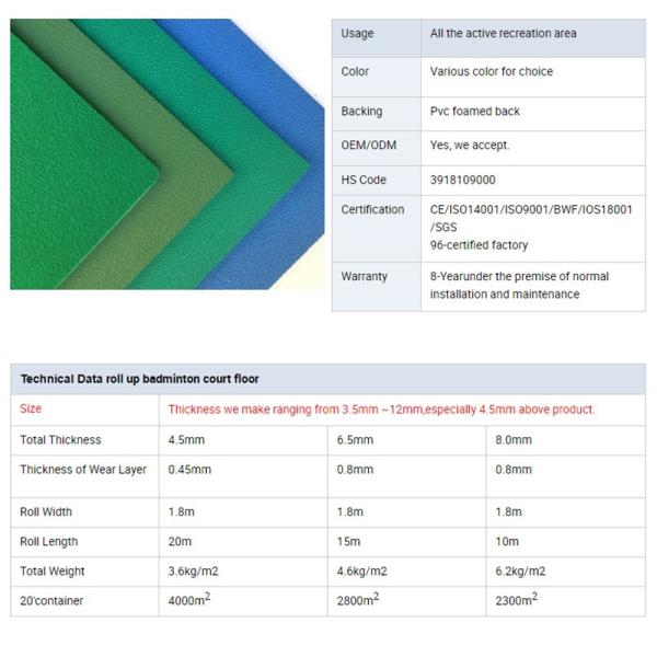 8. Sports provides high performance sports surface PVC flooring mat , which comply with BWF standard for your badminton, table tennis, volleyball, tennis, basketball, handball, indoor basketball, gymnasium, fitness center, school, dancing room, office, school, kindergarten, hospital projects.